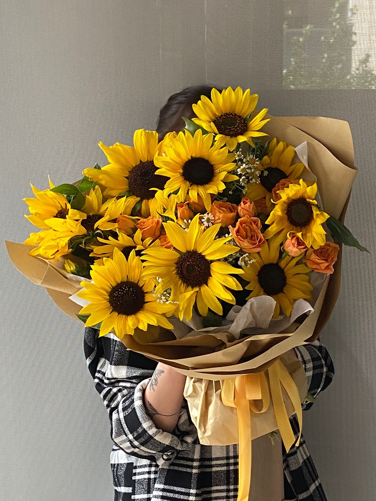 Подсолнух (Голландия) - 10; Спрей роза (Кения) - 3; Ромашка кустовая (Голландия) - 2; Тишью - 2; Крафт - 4; Лента атлас 2 см - 1; Открытка - 1; Шпажка для открытки - 1;
