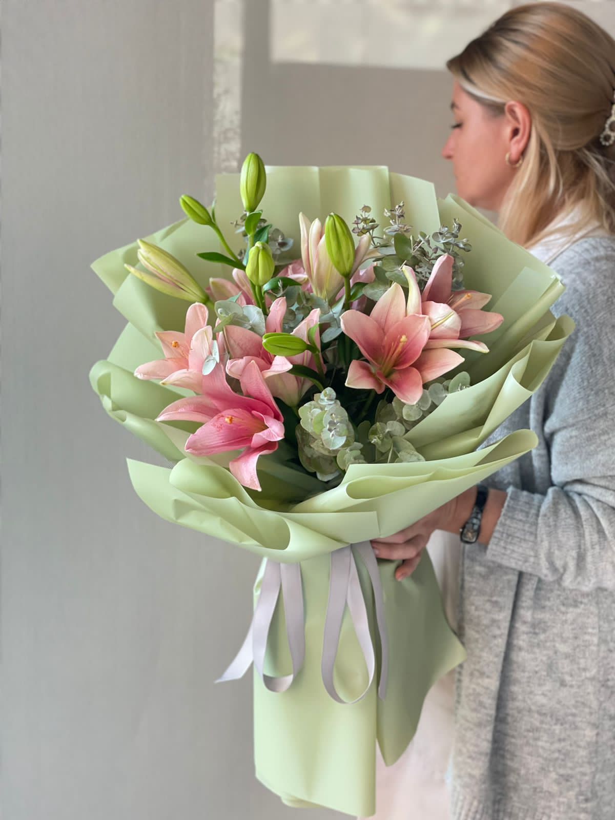 Лилия азиатка (Голландия) - 3; Эвкалипт (Голландия) - 3; Калька в ассортименте - 7; Открытка - 1; Шпажка для открытки - 1;