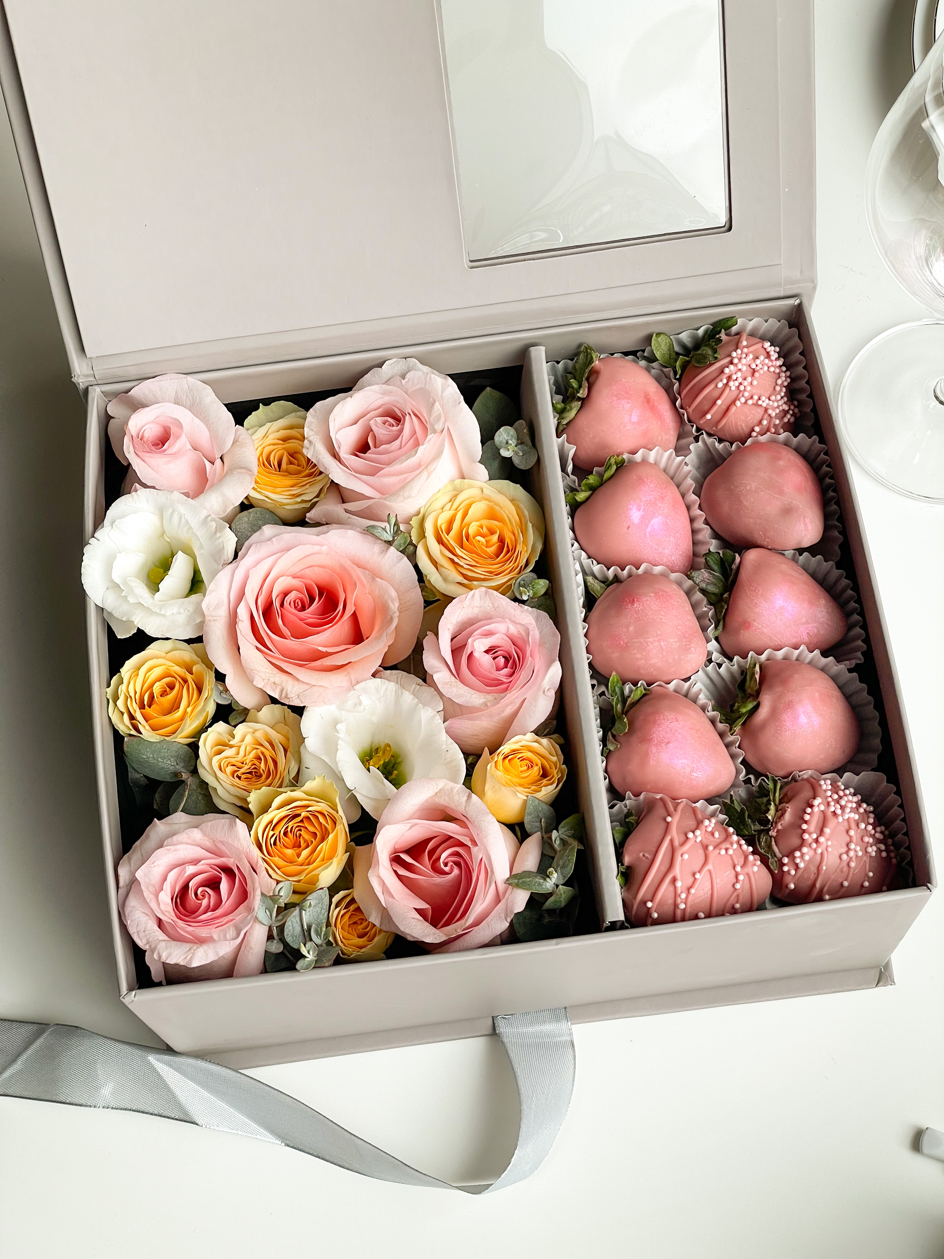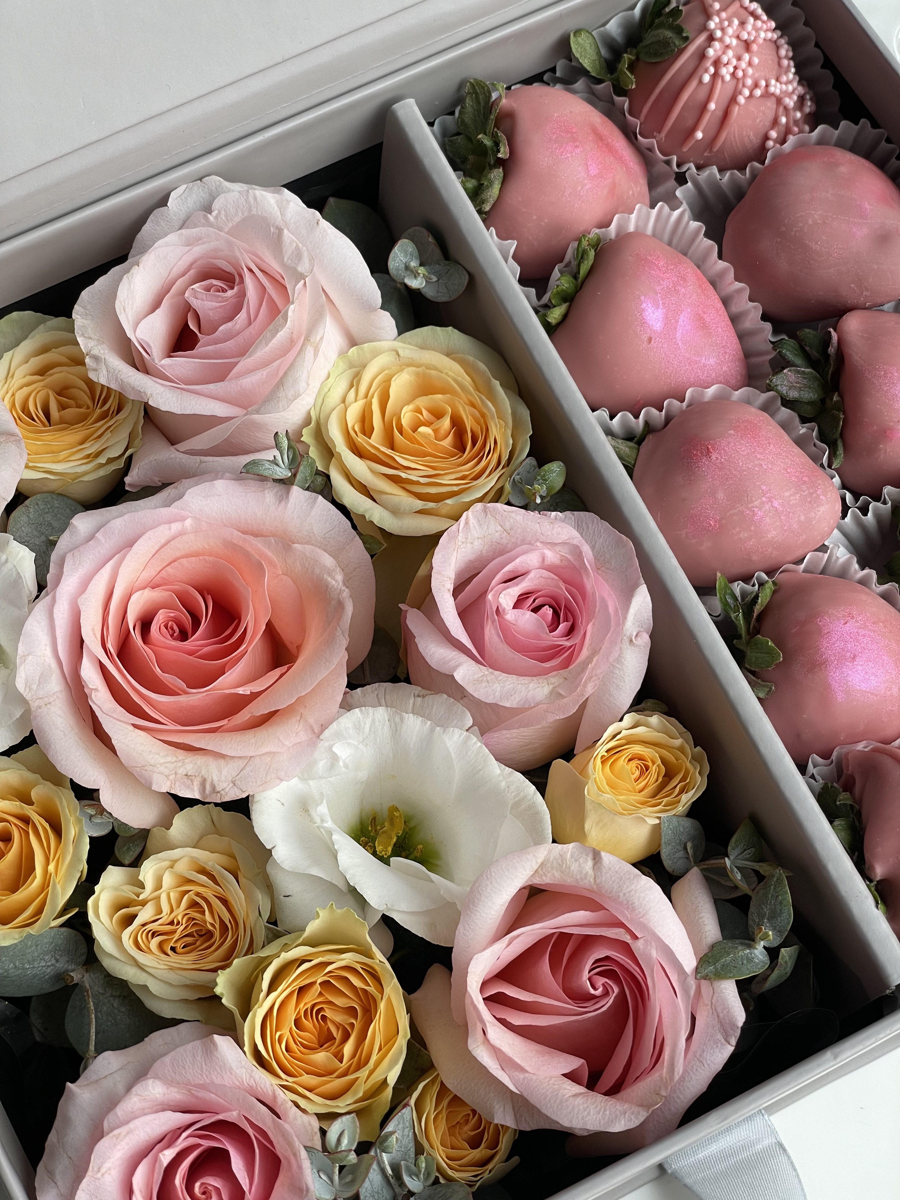 Нежнейшая коробка с клубникой в шоколаде и прятным разнообразием цветов: эвкалипта, лизиантуса, голландской розы и спрей розы.