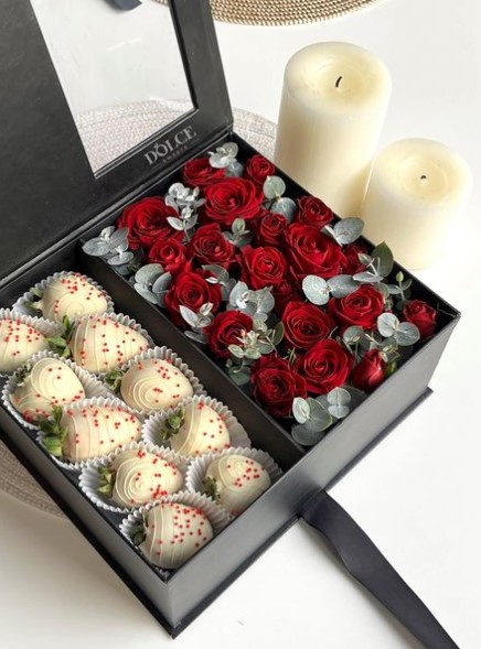 Клубничный бокс "White and Red" клубника в белом шоколаде и розы в шкатулке. Если Вы хотите подарить незабываемые эмоции дорогому человеку — закажите доставку цветов в Zakazbuketovkz
