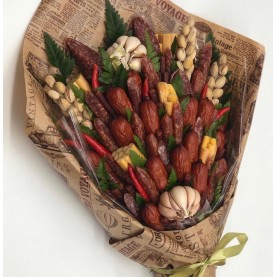 Открытка - 1; Калька в ассортименте - 5; Колбаса копченая в ассортименте 100 гр - 14; Сыр копченый в ассортименте 100 гр - 4; Сухофрукты для букетов 500 гр - 1; Орехи - 1; Шпажка для открытки - 1;
