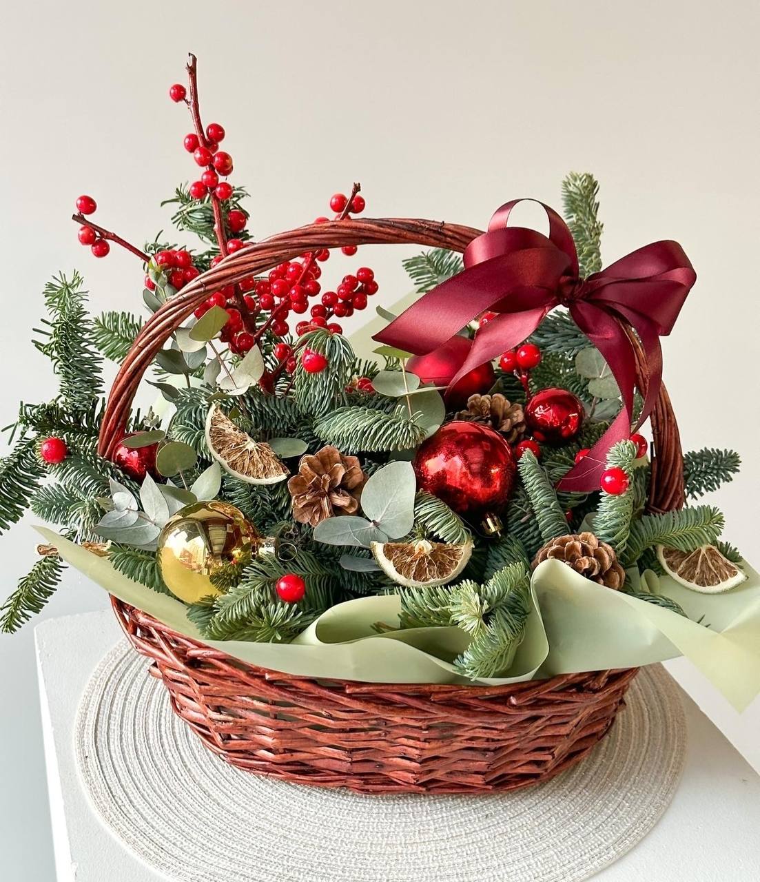 Праздничная корзина с добавлением натурального нобилиса, шишек, рябины, илекса, новогодних игрушек, сушеного лайма и эвкалипта.