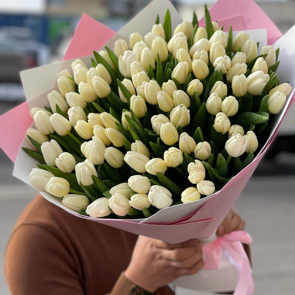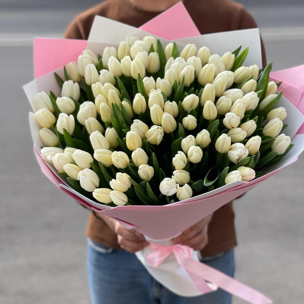 101 белых тюльпан в весеннем оформлении для самого лучшего повода! Если Вы хотите подарить незабываемые эмоции дорогому человеку — закажите доставку цветов в Zakazbuketovkz