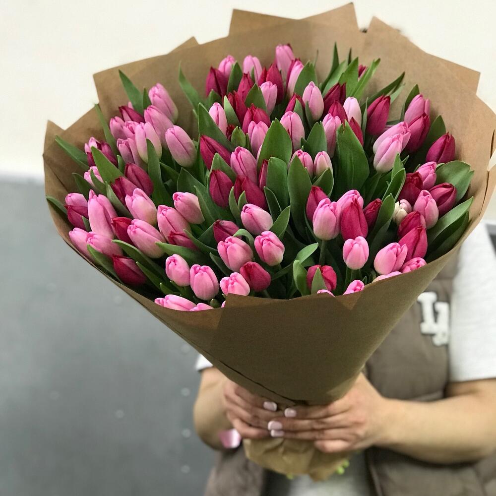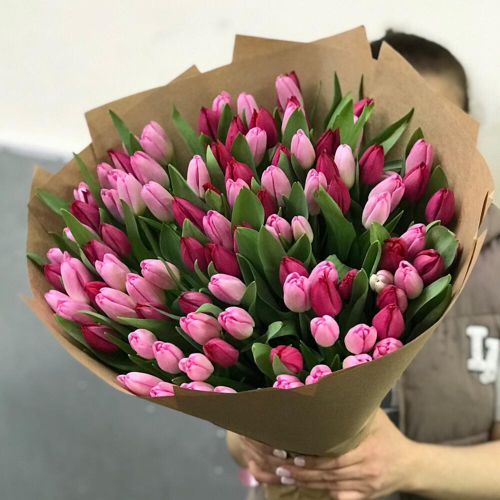 Прекрасный букет из 101 розовых и малиновых тюльпан станет идеальным подарком для самого близкого человека!