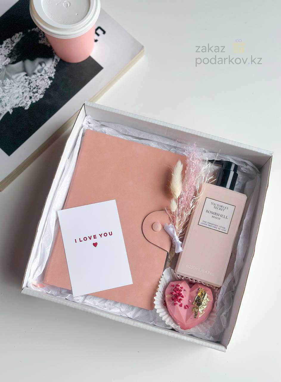 Открытка - 1; Тишью - 1; Сухоцветы (Голландия) - 0.1; Сердце шоколадное (большое) - 1; Блокнот для боксов - 1; Лосьон для тела (для боксов) - 1; Коробка для боксов - 1;