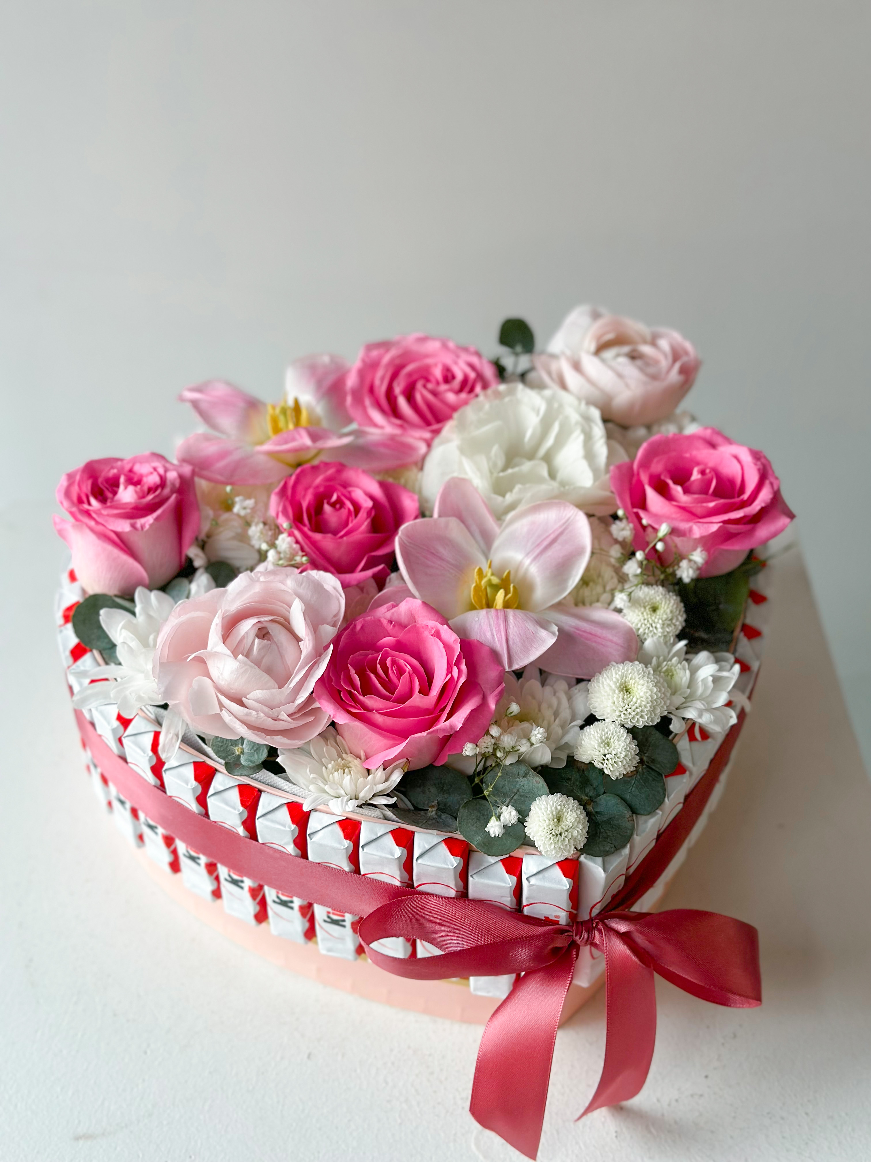 Композиция "Sezim". Роза, хризантема, тюльпан и kinder шоколад в коробке