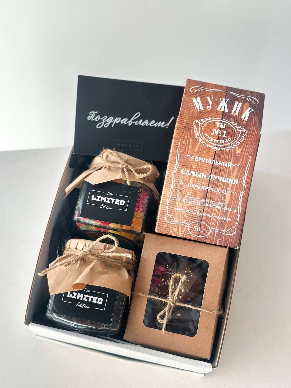 Открытка - 1; Тишью - 1; Чай Сималенд 50 гр - 1; Грецкий орех в ассортименте - 1; Цукаты в ассортименте - 1; Сердце шоколадное (большое) - 1; Банки под орешки - 2; Коробочка для мыла - 1; Коробка для боксов - 1;