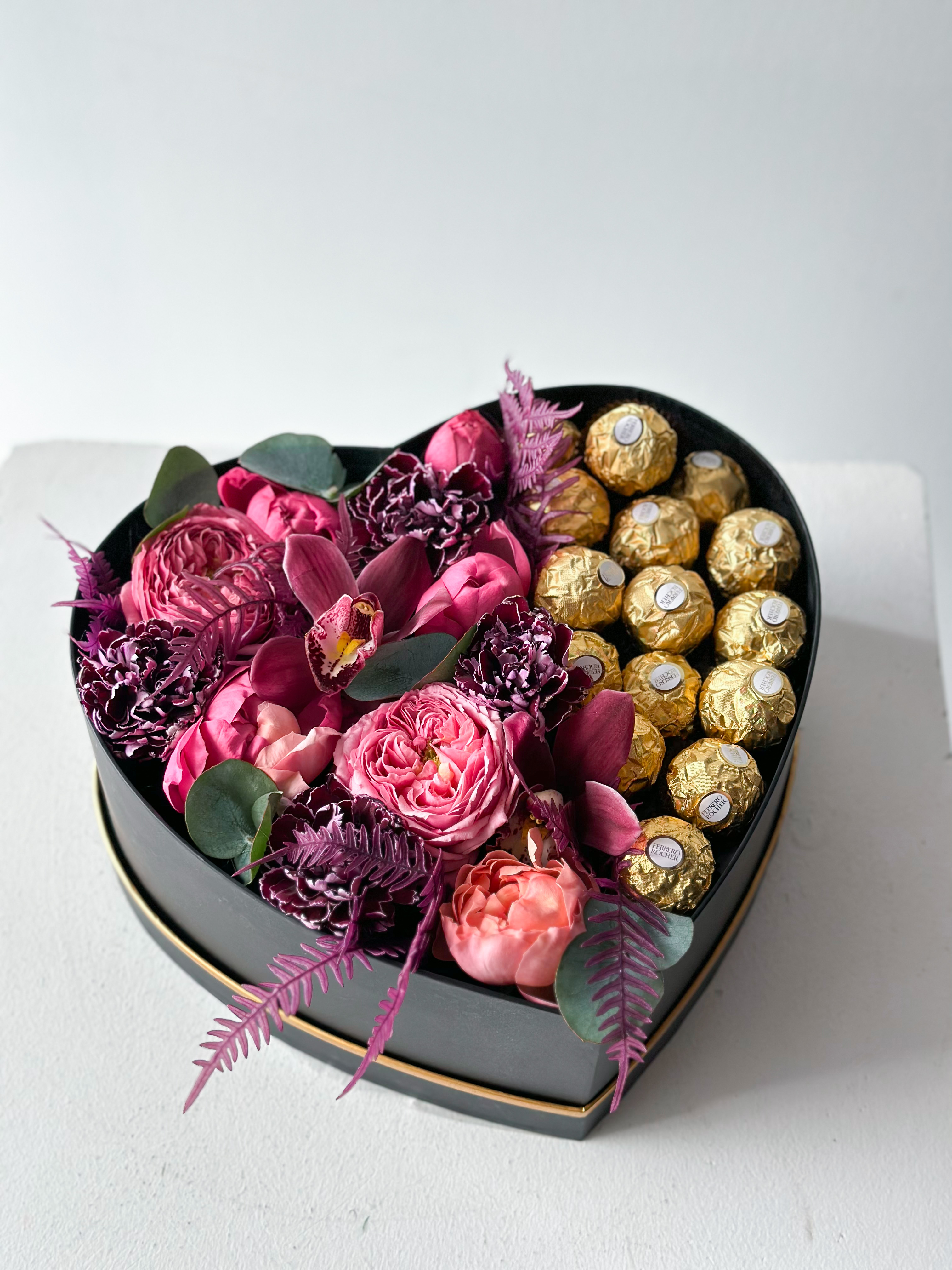 Чудесная подарочная композиция из конфет FERRERO ROCHER и цветов: гвоздик, эвкалипта, спрей роз, папоротника и орхидеи.