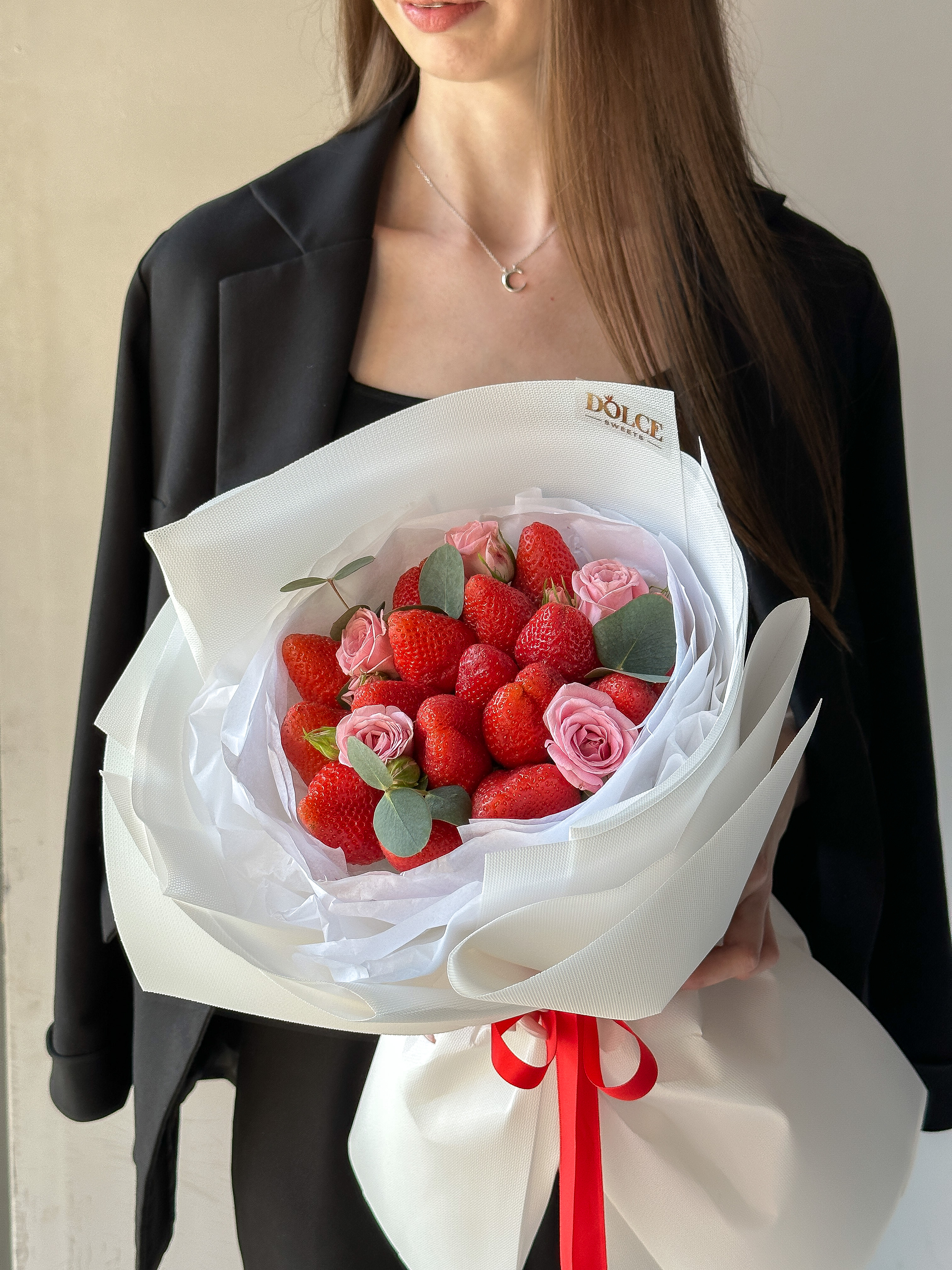 Милый букет для любителей свежей клубники. 16 свежих сочных вкусных ягодок, в сопровождении розочек и эвкалипта.