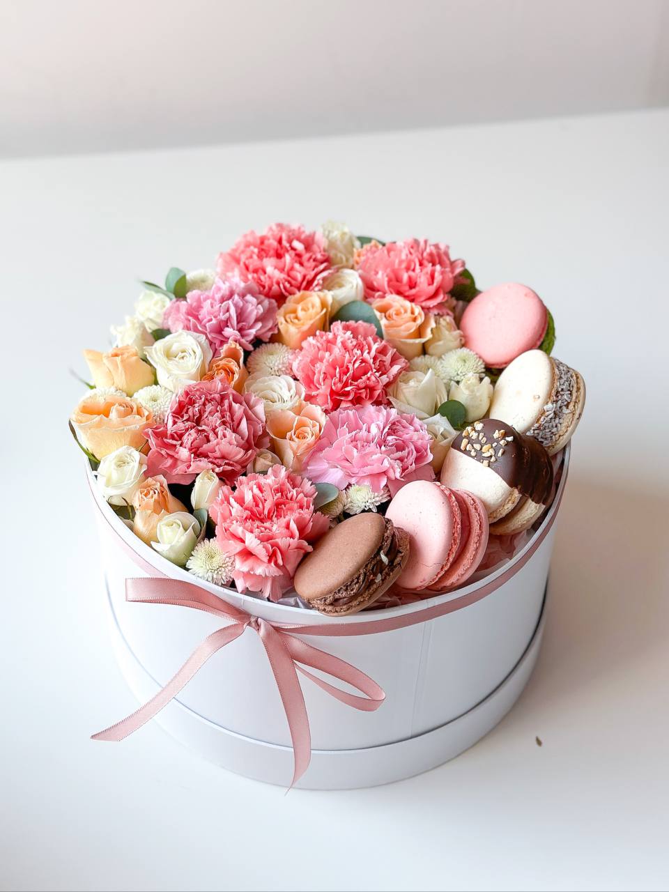 "Жизель" M Спрей розы, гвоздика, хризантемы и макаронс в коробке
