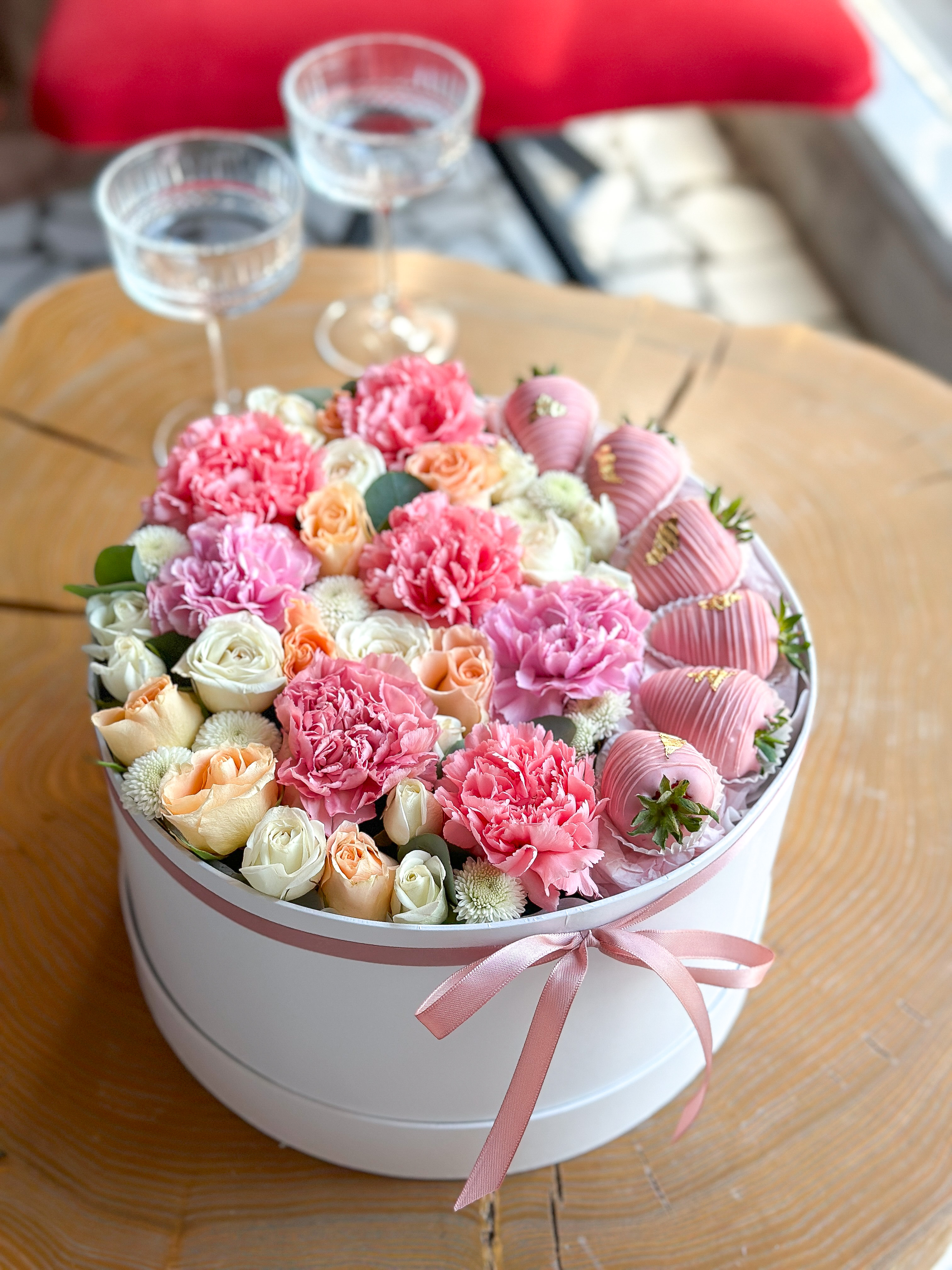 Клубничный бокс с цветами "Жозефина" М Дуэт сочных ягод в шоколаде и цветов прекрасен. Идеальный подарок для любого.