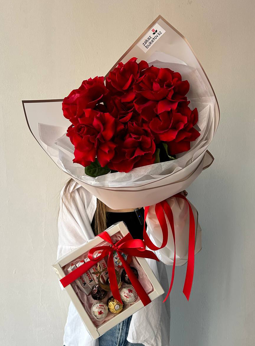 Букет из роз и коробка со сладостями прекрасный способ порадовать близких.