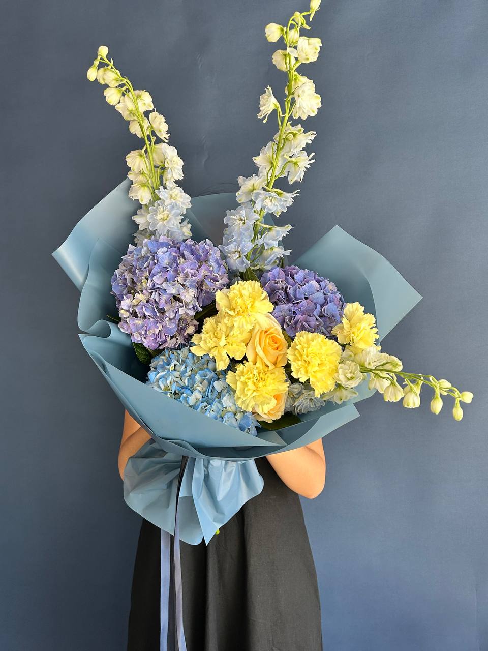 Букет "Звездная ночь" с дельфиниумом, гортензией, розой и гвоздикой в оформлении. Для цветов повод не нужен. Круглосуточно доставляем букеты, которые вызывают восторг и улыбку.