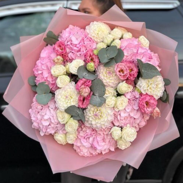 Гортензия (Колумбия) - 6; Эвкалипт (Голландия) - 5; Лизиантус (Израиль) - 3; Георгин (местный) - 5; Спрей роза пионовидная (Кения) - 5; Калька в ассортименте - 4; Открытка - 1; Шпажка для открытки - 1;