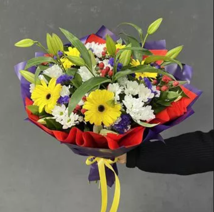 Лилия азиатка (Голландия) - 3; Гербера (Голландия) - 5; Хризантема кустовая (Голландия) - 5; Гипперикум (Голландия) - 5; Статица (Голландия) - 3; Рускус (Голландия) - 10; Калька в ассортименте - 5; Открытка - 1;