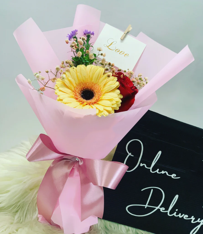 Букетик из герберы, розы и гипсофилы в оформлении. Если Вы хотите подарить незабываемые эмоции дорогому человеку — закажите доставку цветов в Zakazbuketovkz