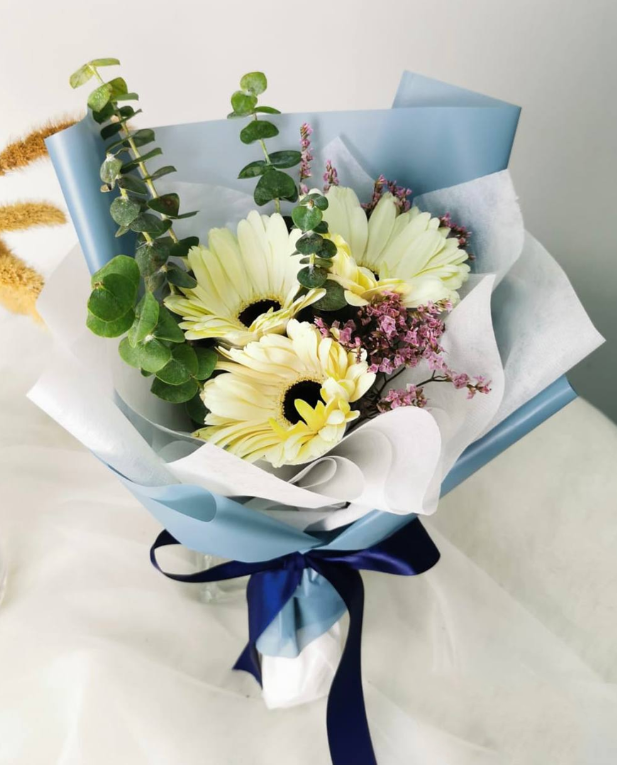 Гербера (Голландия) - 3; Вакс (Голландия) - 1; Эвкалипт (Голландия) - 1; Калька в ассортименте - 4; Открытка - 1;