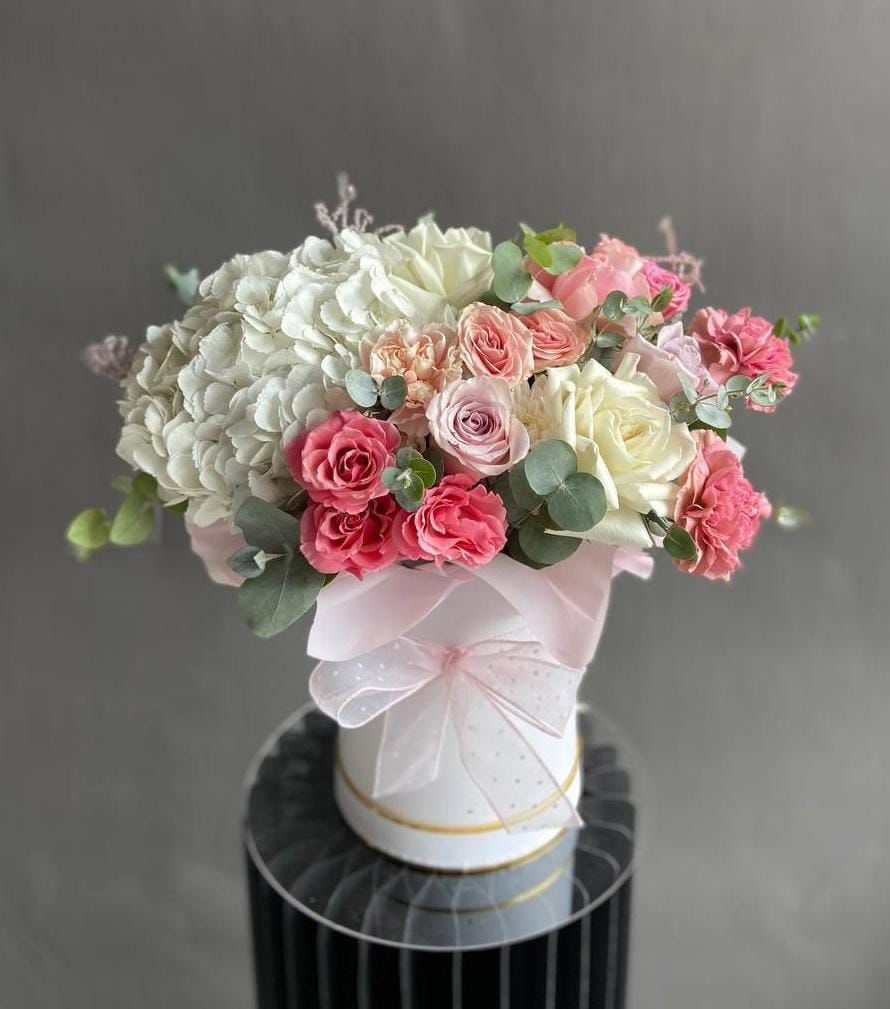 Композиция "Линдси" с гортензией, спрей розой, хризантемой и гвоздикой в коробке. Если Вы хотите подарить незабываемые эмоции дорогому человеку — закажите доставку цветов в Zakazbuketovkz