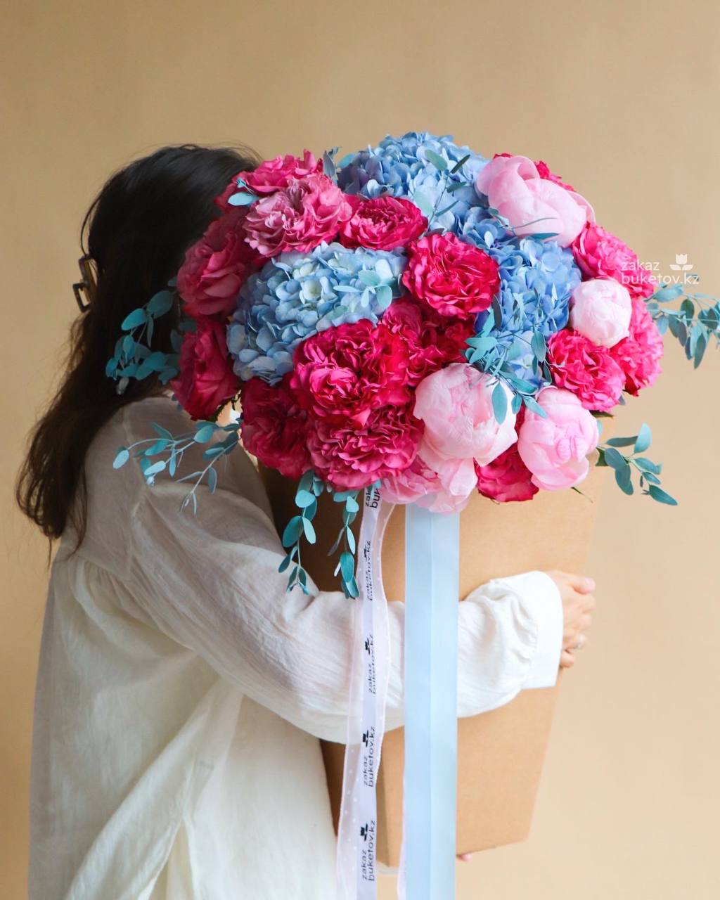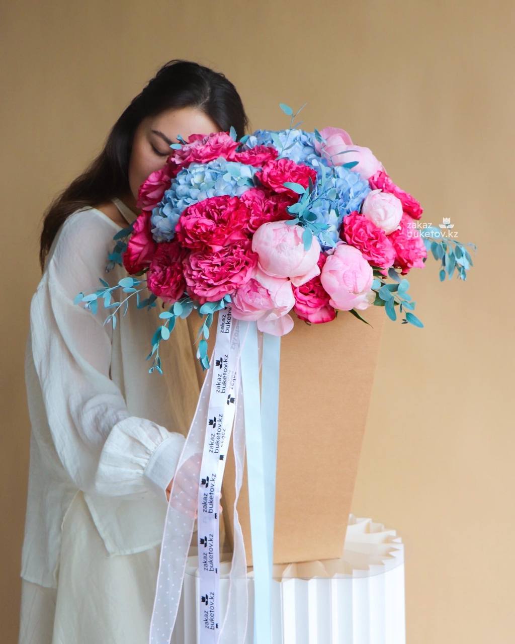 Шикарный букет "Аделин" с пионом, гортензией и розами в стильном оформлении. Если Вы хотите подарить незабываемые эмоции дорогому человеку — закажите доставку цветов в Zakazbuketovkz