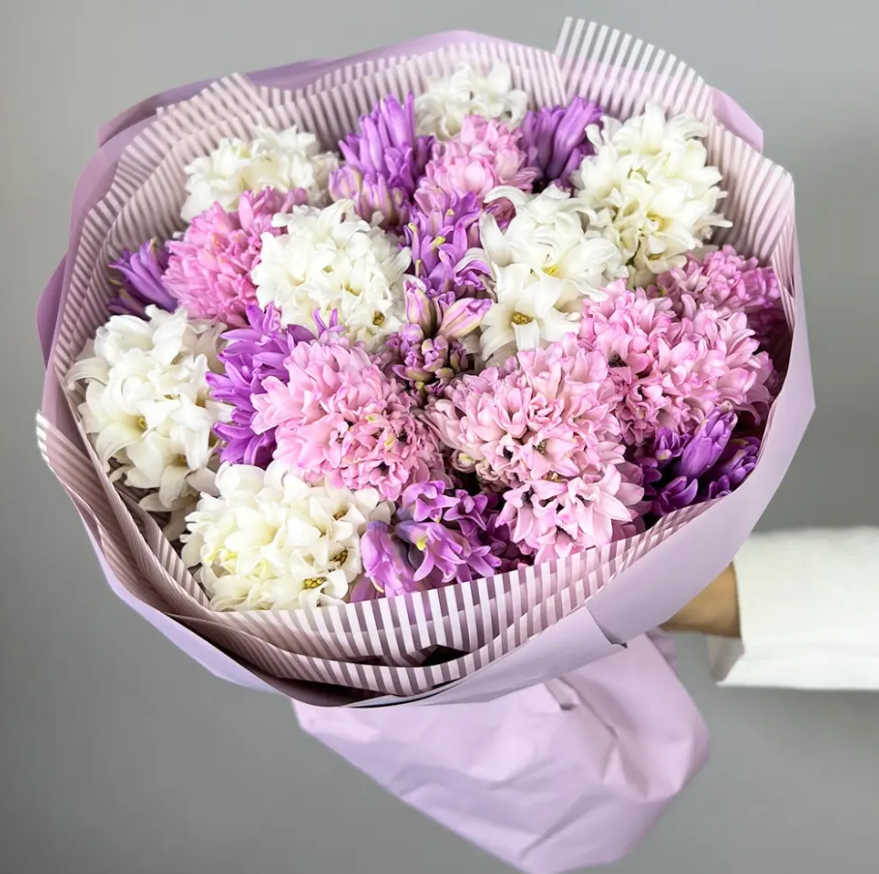 Моно букет из 19 гиацинтов в оформлении. Если Вы хотите подарить незабываемые эмоции дорогому человеку — закажите доставку цветов в Zakazbuketovkz