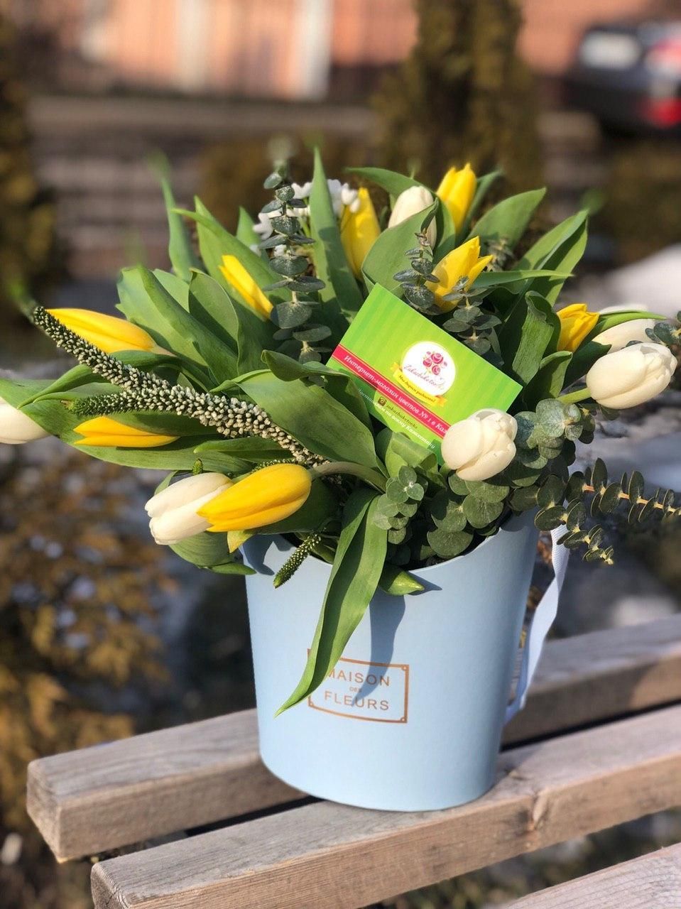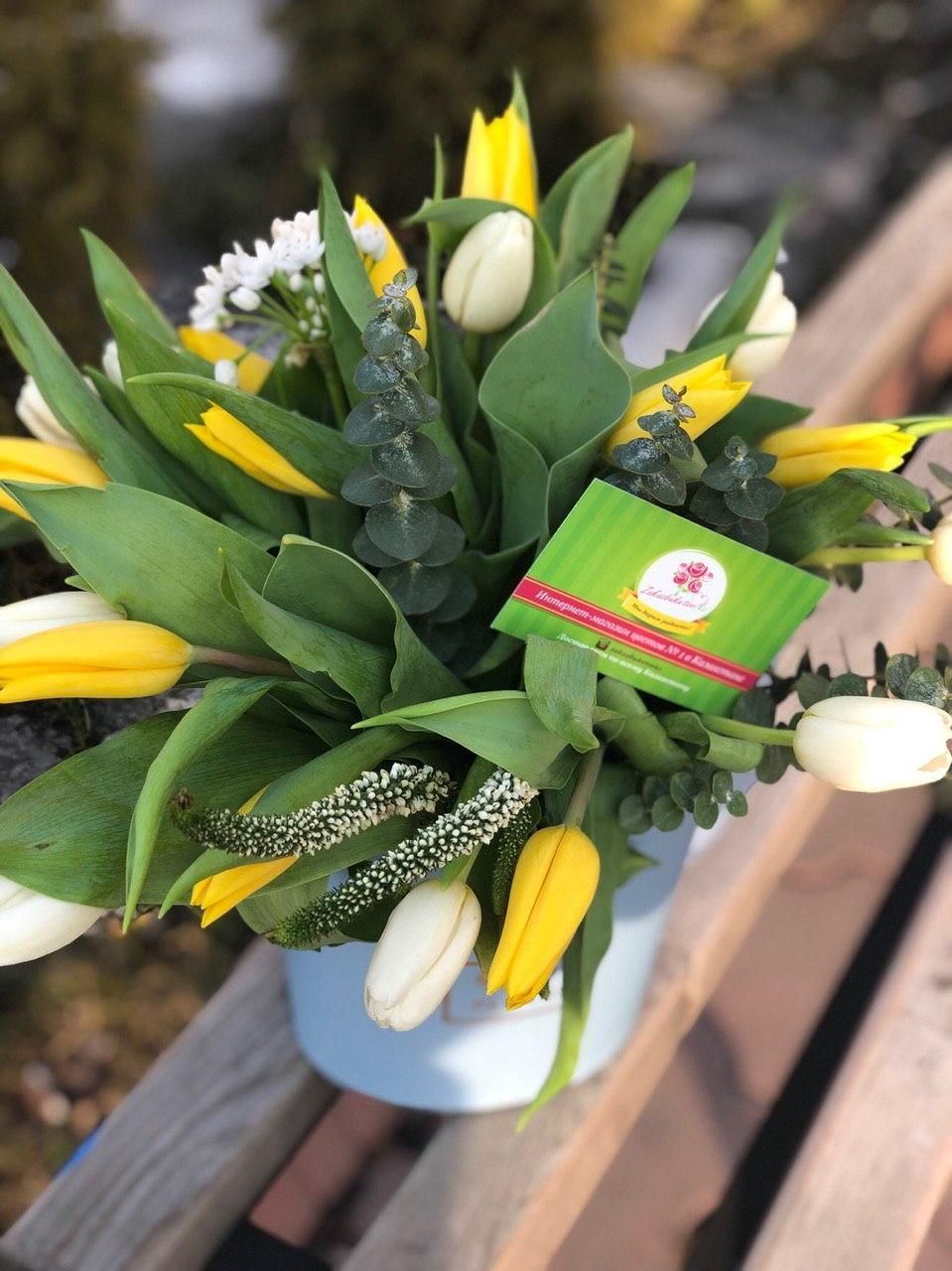 Тюльпан (Голландия) - 19; Эвкалипт (Голландия) - 3; Цветочная сумка - 1; Открытка - 1; Шпажка для открытки - 1;